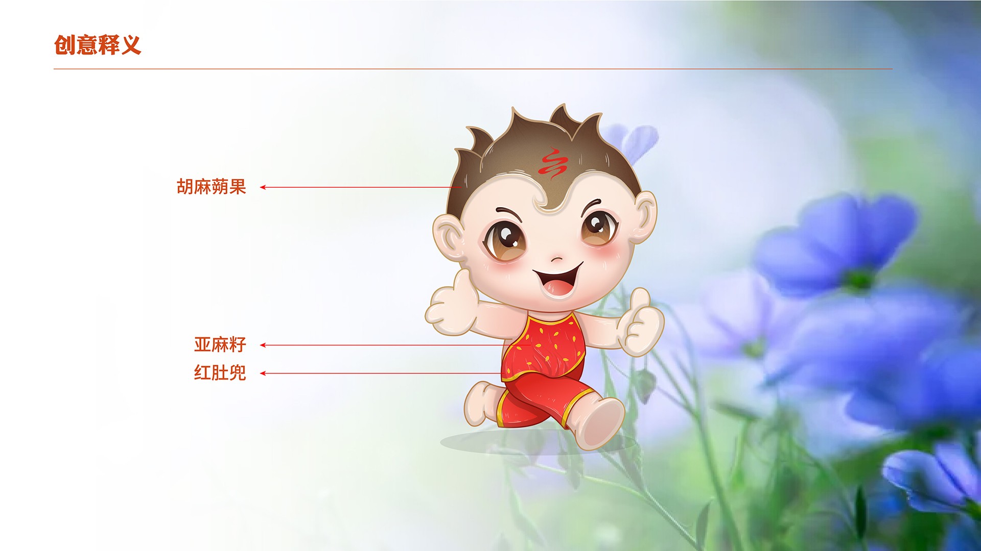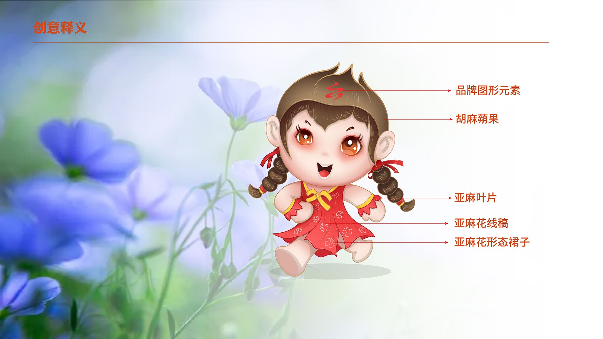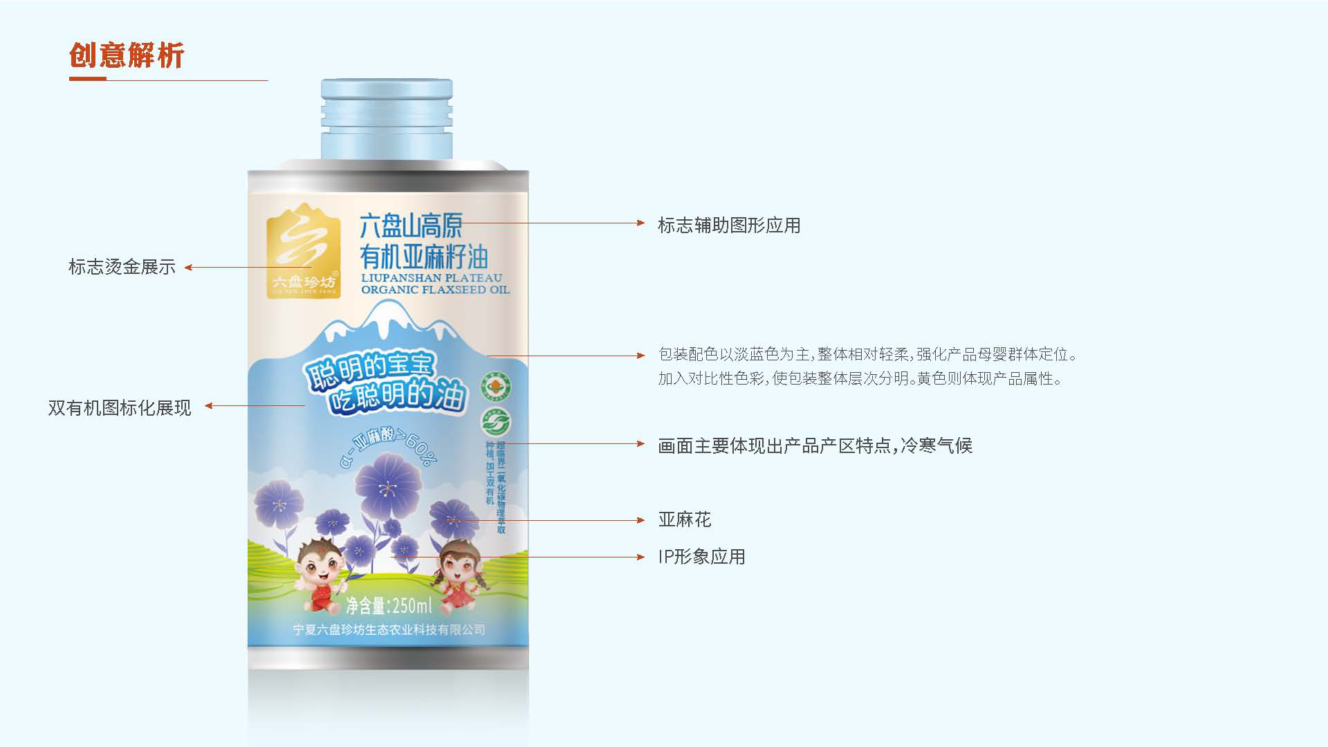 4、產品屬性:亞麻籽油是亞麻花的提取物,在女娃的設計上綠色手繩為亞麻花葉,衣裙為紫是亞麻花的顏色,裙子上的斑點是亞麻花,裙身下擺整體也勾勒出亞麻花的形態;男娃設定上,肚兜的斑點為亞麻籽。