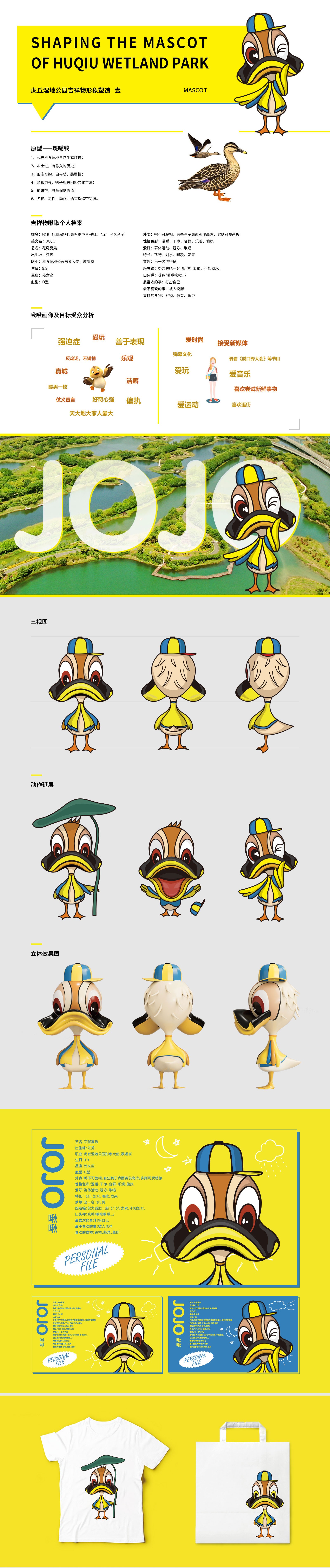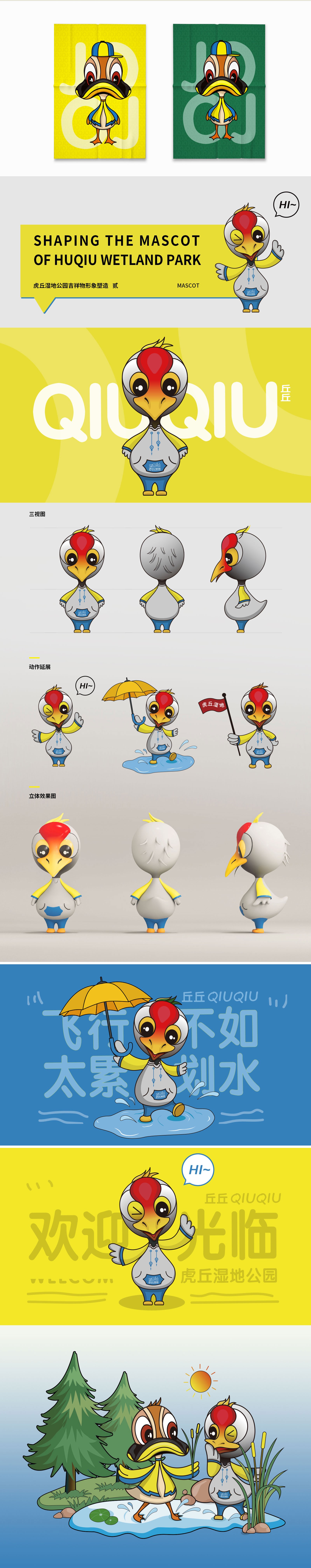 吉祥物作為一個物化的“代言人”,具有承當溝通大眾、宣傳理念的重要作用,基于此,石特對虎丘濕地公園吉祥物承載的功能與價值進行一系列的分析與思考。我們以斑嘴鴨為原型對虎丘濕地公園吉祥物進行設計創作,為突出虎丘濕地自然生態環境這一重要特征,融入地區特有元素,進而擬化出形態可掬,自帶萌性的卡通形象,其整體色系明亮活潑,動作萌趣可愛,賦予了吉祥物靈動、親和之感。吉祥物取名“啾啾”,似有鳴禽聲音,并與虎丘的“丘”字諧音,朗朗上口,精簡明確。本次石特為虎丘濕地公園吉祥物全案的成功策劃,得到了客戶的高度認可。
