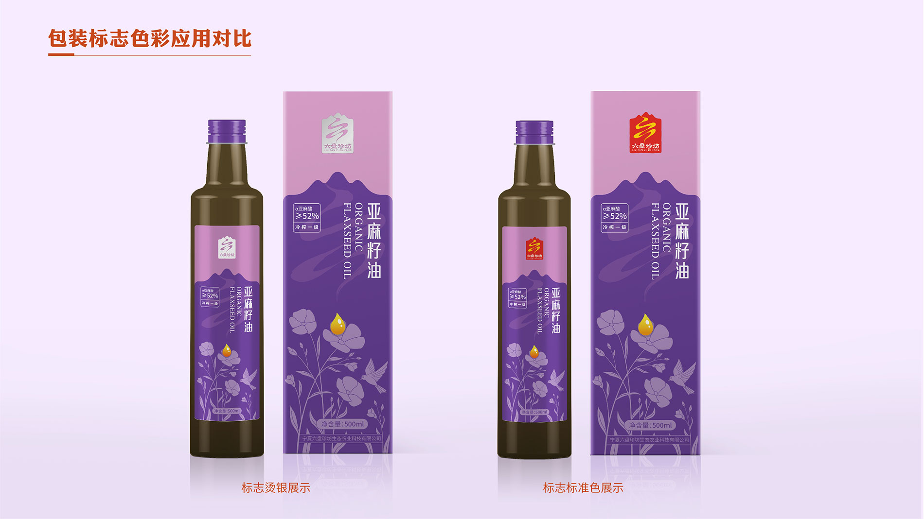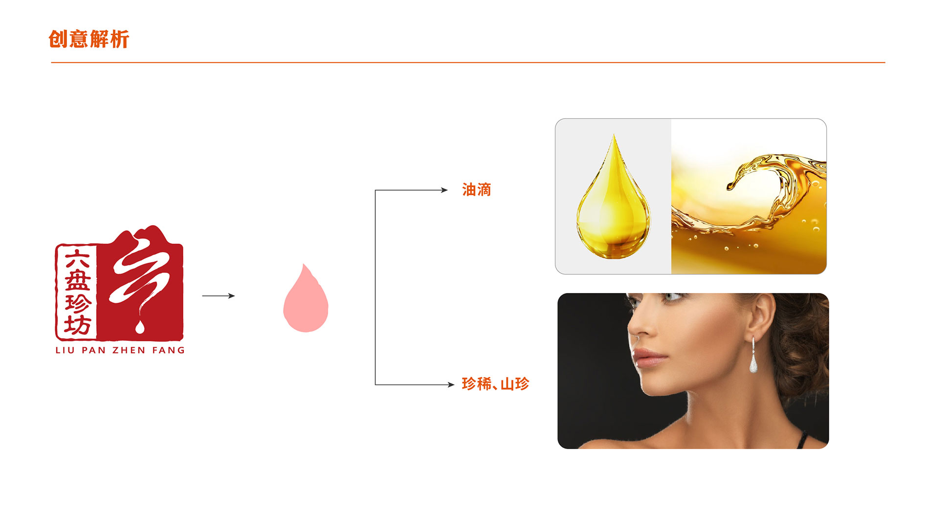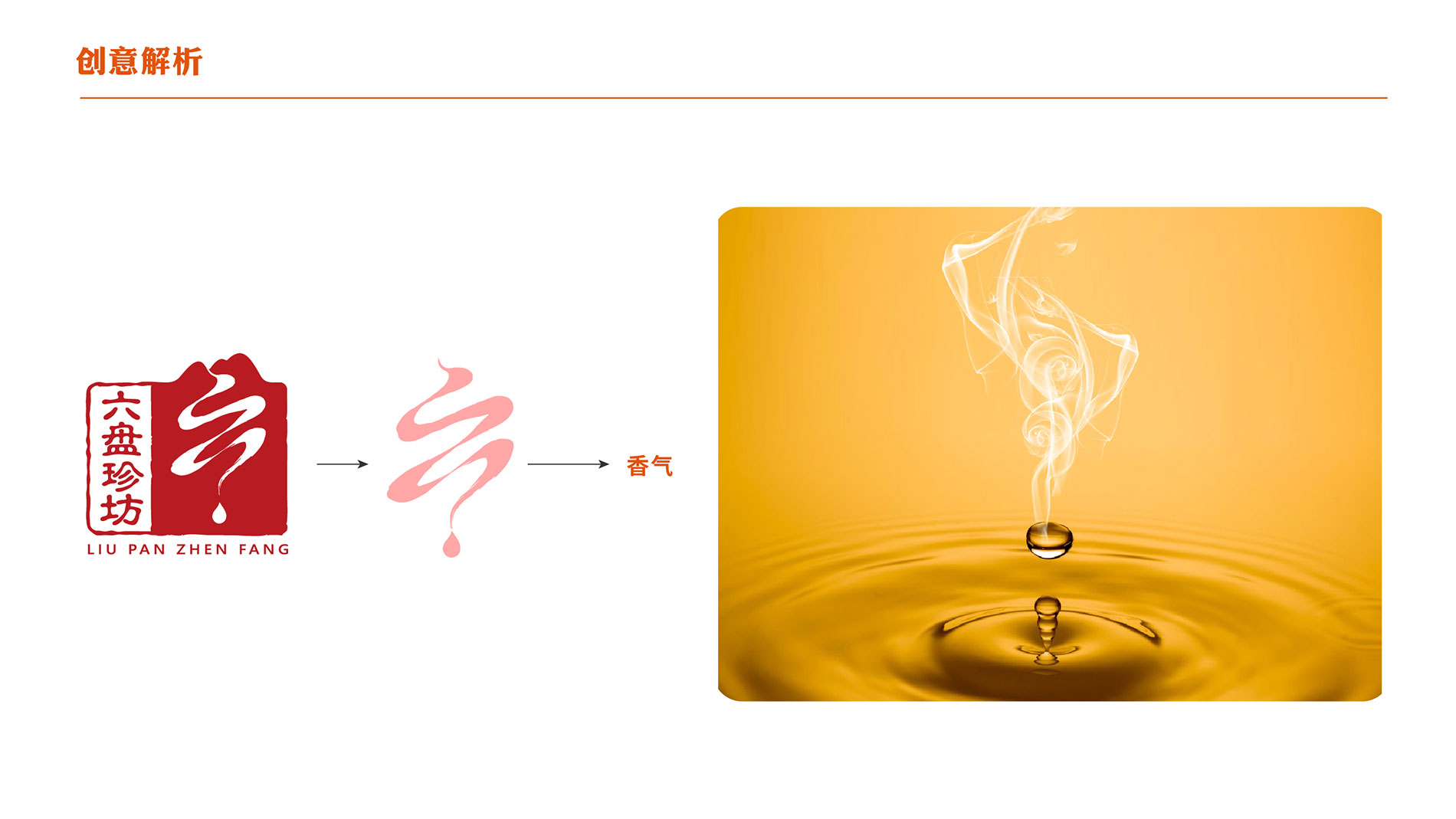 三、油滴:圖形底部油滴形態的融入,與企業食用油產品液體特性相呼應,凸顯品牌行業屬性。油滴的形態也如同鉆石,鉆石具有稀有、珍貴性,與品牌名中“珍”字形成聯想和呼應。“六”字與液滴的融合,整體如同匯山川之精華于一滴,凸顯企業產品品質。“六”字書法形態,也如同煙霧一般,與油滴的形態相融合,如同油滴正在散發清香之氣,彰顯產品品質的同時,也使logo更具動態感。