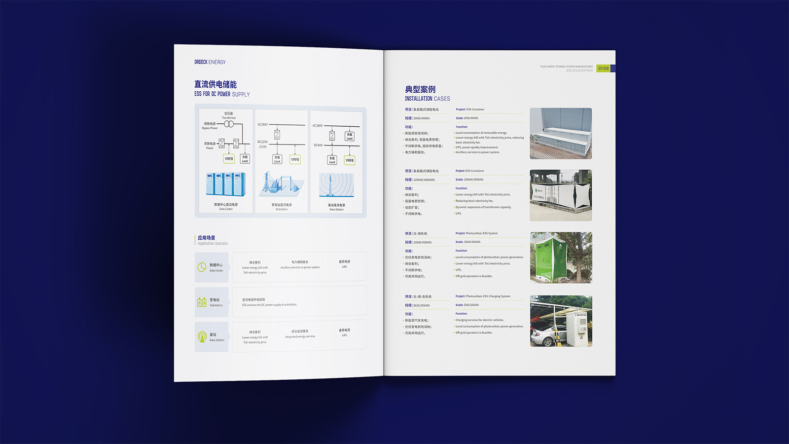 企業的畫冊設計要站在品牌建設的高度,不僅需要展現企業的品牌形象,還需要設計出品牌的個性來,基于此,在此次的畫冊設計中,石特提出了新的想法。封面封底以淡綠色和深藍色為主,帶給人一種嚴謹務實、值得信任的感覺;內容上首先以圖文結合的形式先對企業的基本情況進行介紹,然后闡述了全釩液流電池技術的原理以及應用場景,并對儲能電站的相關知識進行了科普,最后以典型案例、產品系列、資質認證的介紹為結尾,該畫冊簡潔美觀、主次分明,德海艾科人嚴謹務實的工作態度和創新的精神得到了系統且充分的展示。
