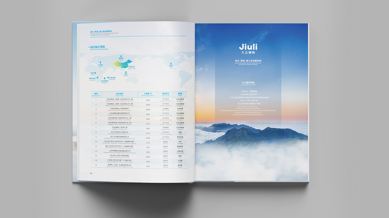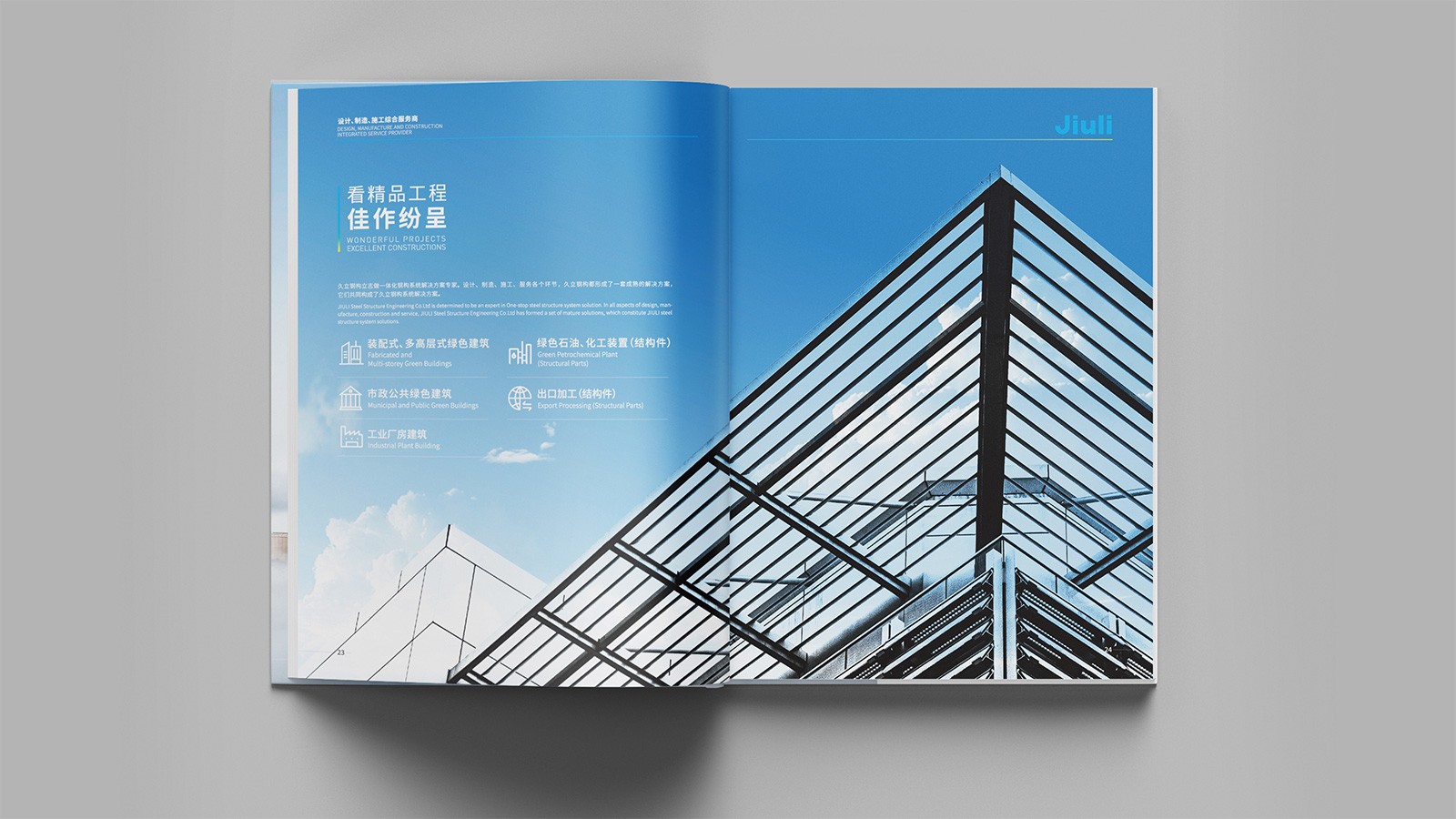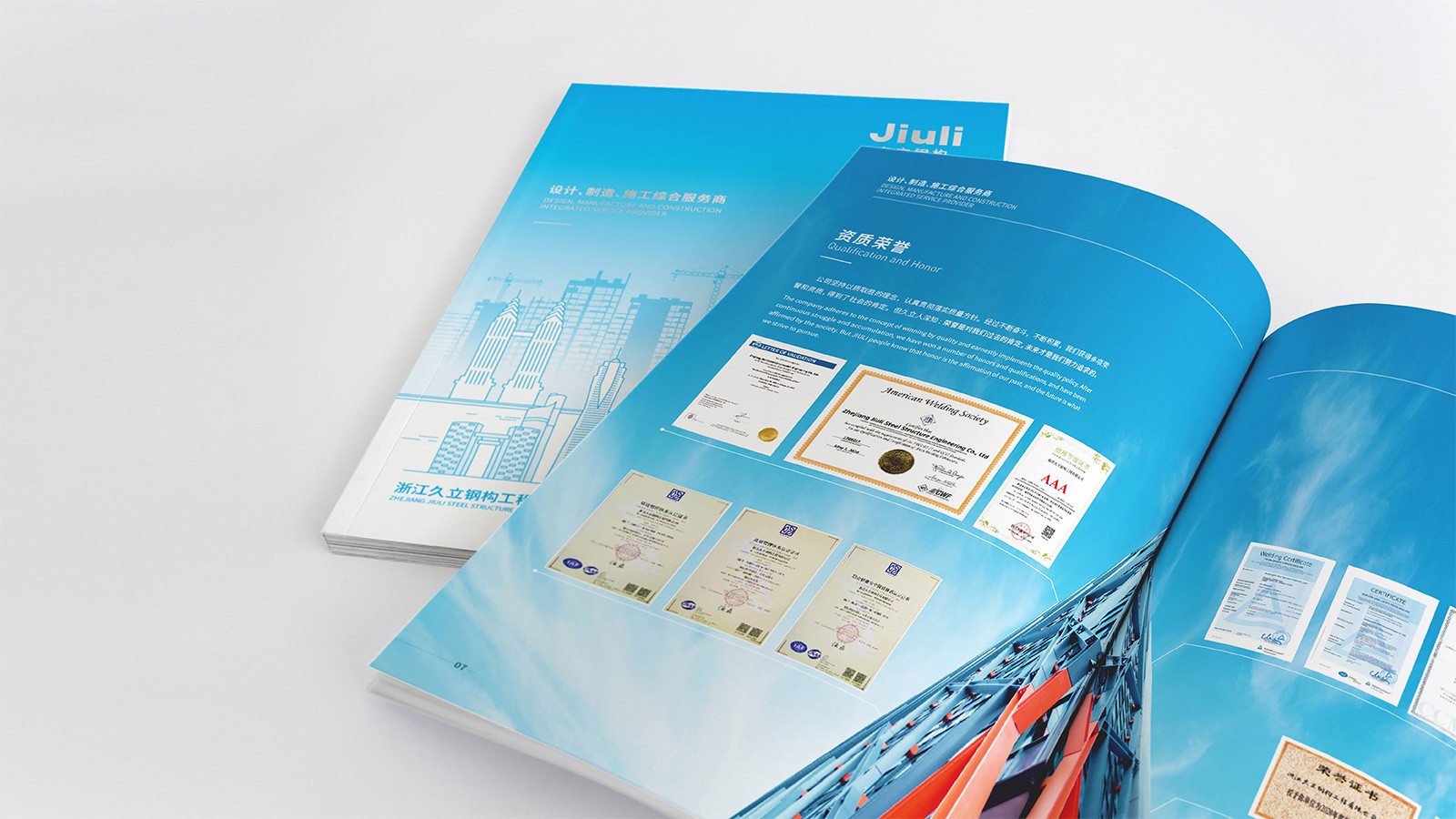 浙江久立鋼構工程有限公司創建于2001年2月,地處中國經濟最具活力之稱的“長三角”太湖南岸——浙江省湖州市,是久立集團的全資子公司,公司建有完善的質保體系,通過了ISO9001:2015質保體系的認證。擁有建設部頒發的鋼結構專業承包壹級資質。承接各類工業與民用鋼結構的設計、制造和安裝。公司立足國內市場,目前已在全國建立多個營銷辦事處,逐步形成了輻射全國的營銷網絡,并積極參與國際競爭?!耙猿墒斓募夹g和可靠的產品質量服務用戶,貢獻社會,發展自己”是久立的文化,可見公司對宣傳冊設計有著較高的要求,因此委托石特設計一本體現公司理念的宣傳冊。