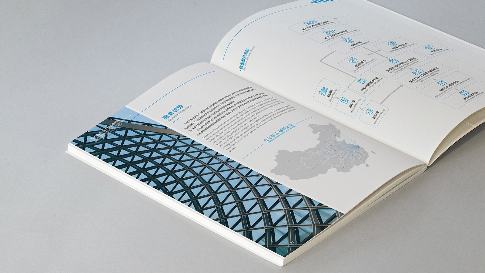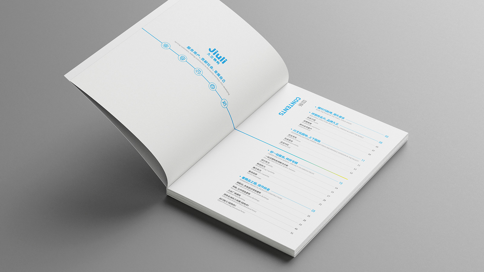 石特分析了當前宣傳冊突出存在的問題,明確了升級的方向,開始了全新宣傳冊的設計:在封面封底的設計中,石特結合久立logo符號及代表鋼結構行業屬性的符號作為畫面主元素,色彩延續企業基本規范,整體版式簡潔,通過凹凸、局部UV等工藝提升質感;在內容上,石特把從握時代脈搏,潮頭奮進、持鋼構名片,品牌久立、興文化園地,上下融融、創一站服務,樣樣專精、看精品工程,佳作紛呈等五個篇章,講述了久立的故事,展示了久立的特點。畫冊通篇,圖文結合,主次有序,重點突出,全面展示了久立鋼構工程有限公司的綜合實力。