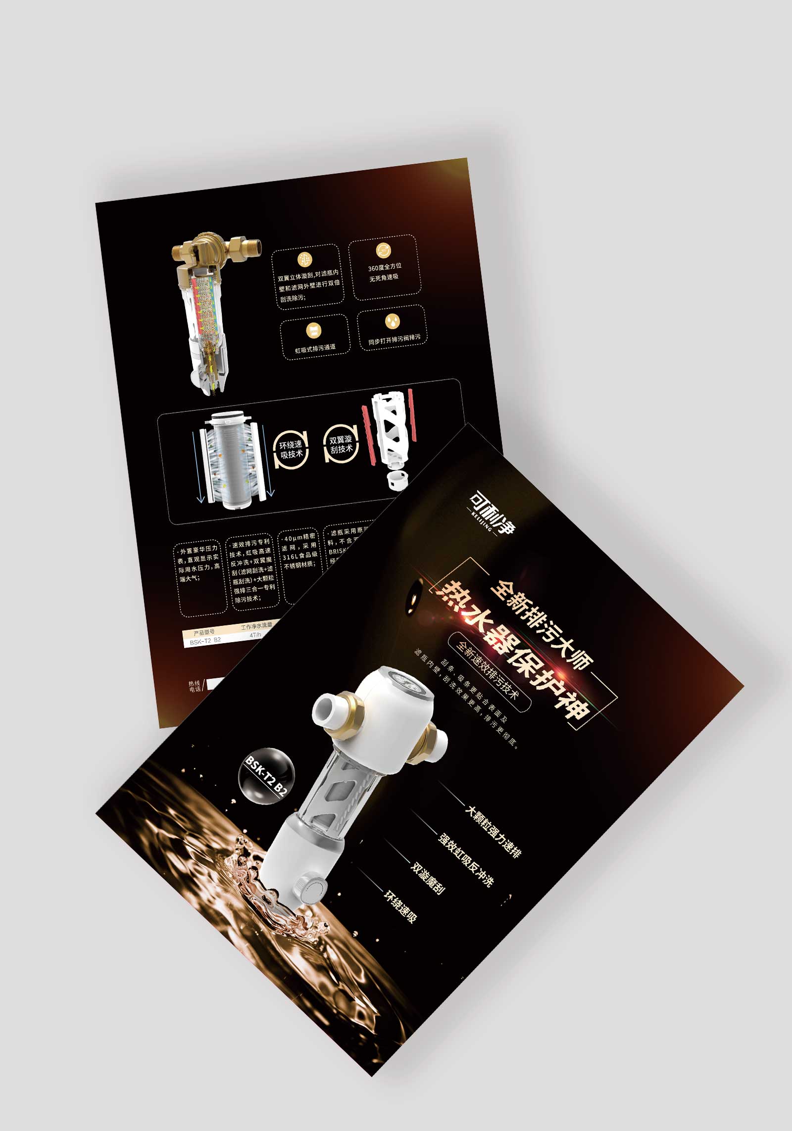 LOGO設計,字體筆畫橫平豎直,但筆鋒圓潤,表現出金屬感的同時,也表現出浴室水的感覺,是一種堅硬和柔軟的矛盾結合;單頁設計以暗色為主,突出產品特性,再加以高光點綴,顯得整體買點突出及優勢。