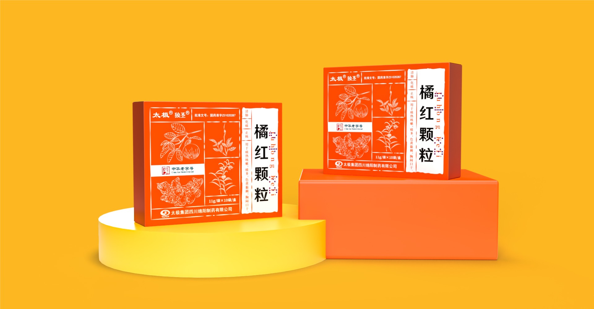 橘紅顆?!弊鳛橹腥A老字號的中成藥,其包裝設計充分融合了傳統與現代元素,既展現了藥品的深厚文化底蘊,又體現了現代審美觀念。在色彩選擇上,包裝采用了鮮明的橙色背景,象征著活力與健康,同時也與中藥的溫暖屬性相契合。白色圖案和文字在橙色背景的映襯下更加醒目,使得包裝信息一目了然。