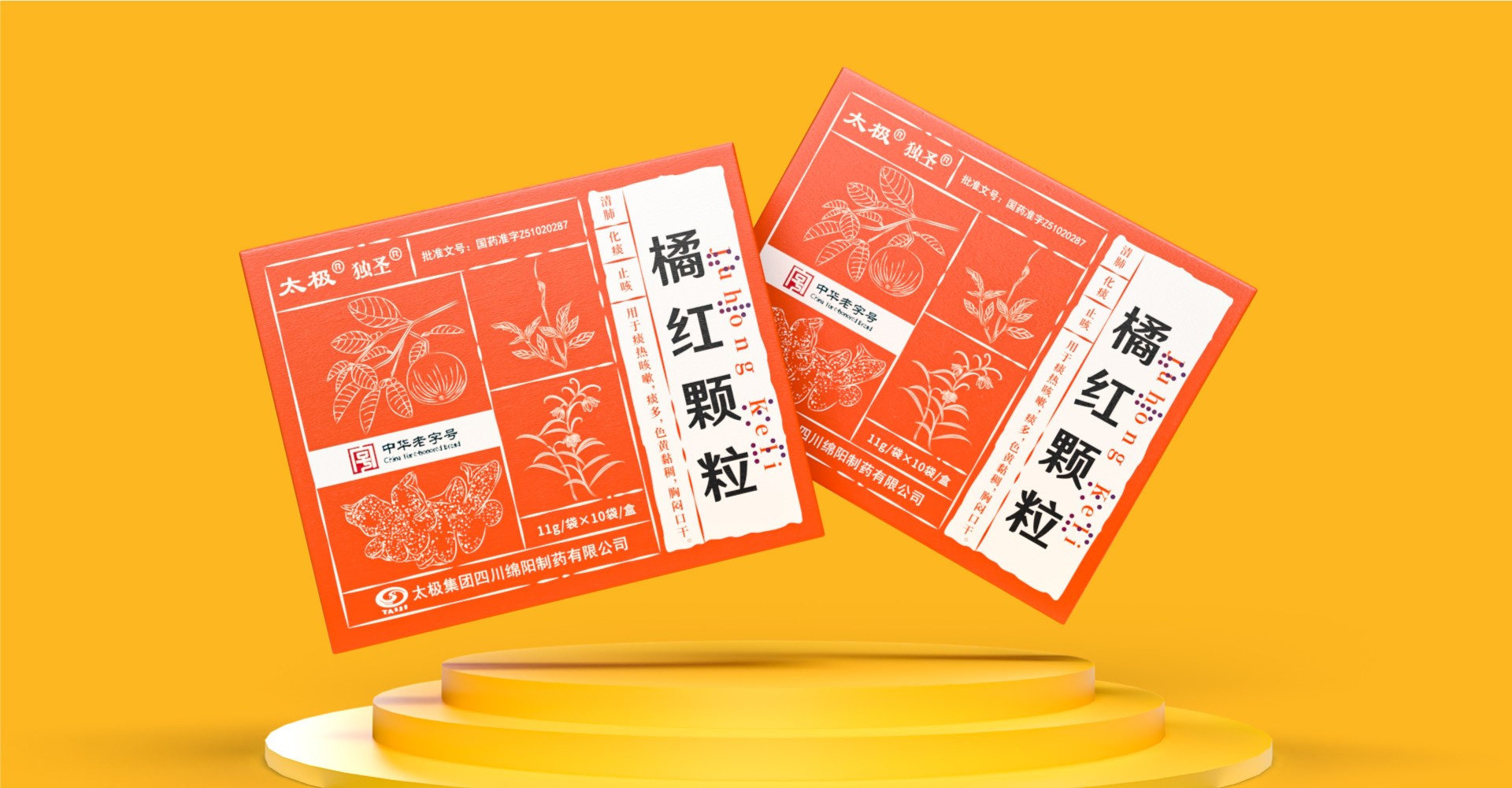 圖案設計上,包裝巧妙地運用了植物元素,一朵花、一片葉子和一個果實的組合,不僅美觀大方,而且寓意著中藥來源于自然、回歸自然的理念。這些圖案與“橘紅顆?!钡拿Q相呼應,強化了產品的中草藥特性。