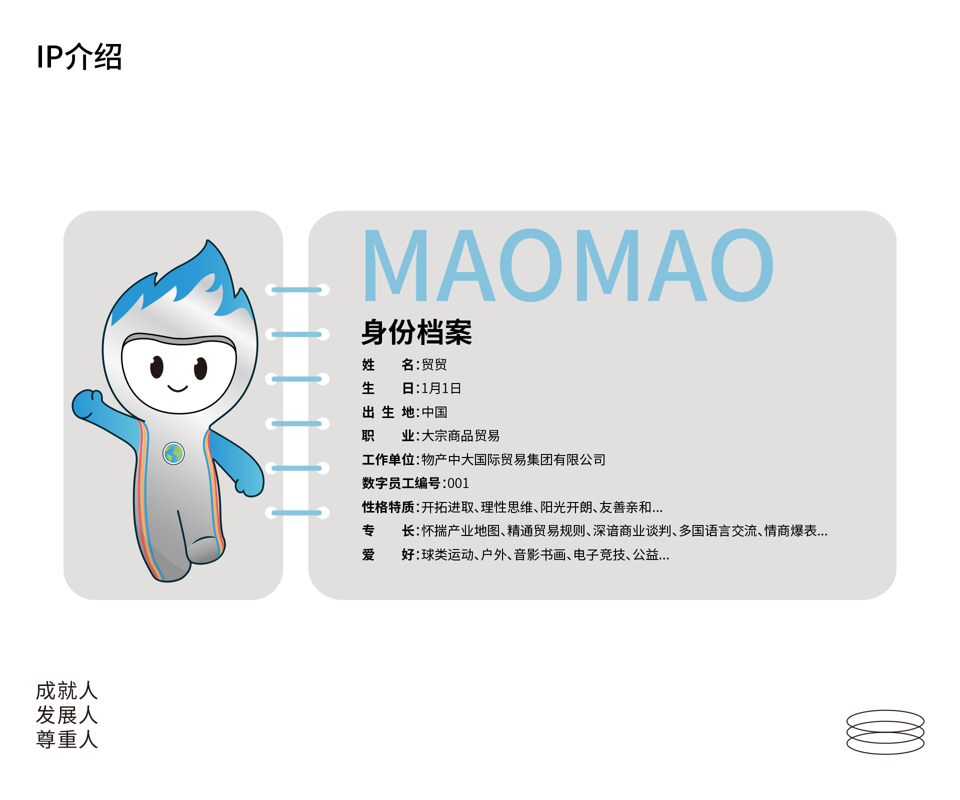 2. 主IP“貿貿”形象塑造: 設計出名為“貿貿”的主IP形象,賦予其完整的身份檔案——1月1日生日、數字員工編號001、精通貿易規則與多國語言等細節設定,使形象真實可感。視覺上采用親和、現代的造型語言,傳遞出專業可靠又不失活力的品牌氣質。