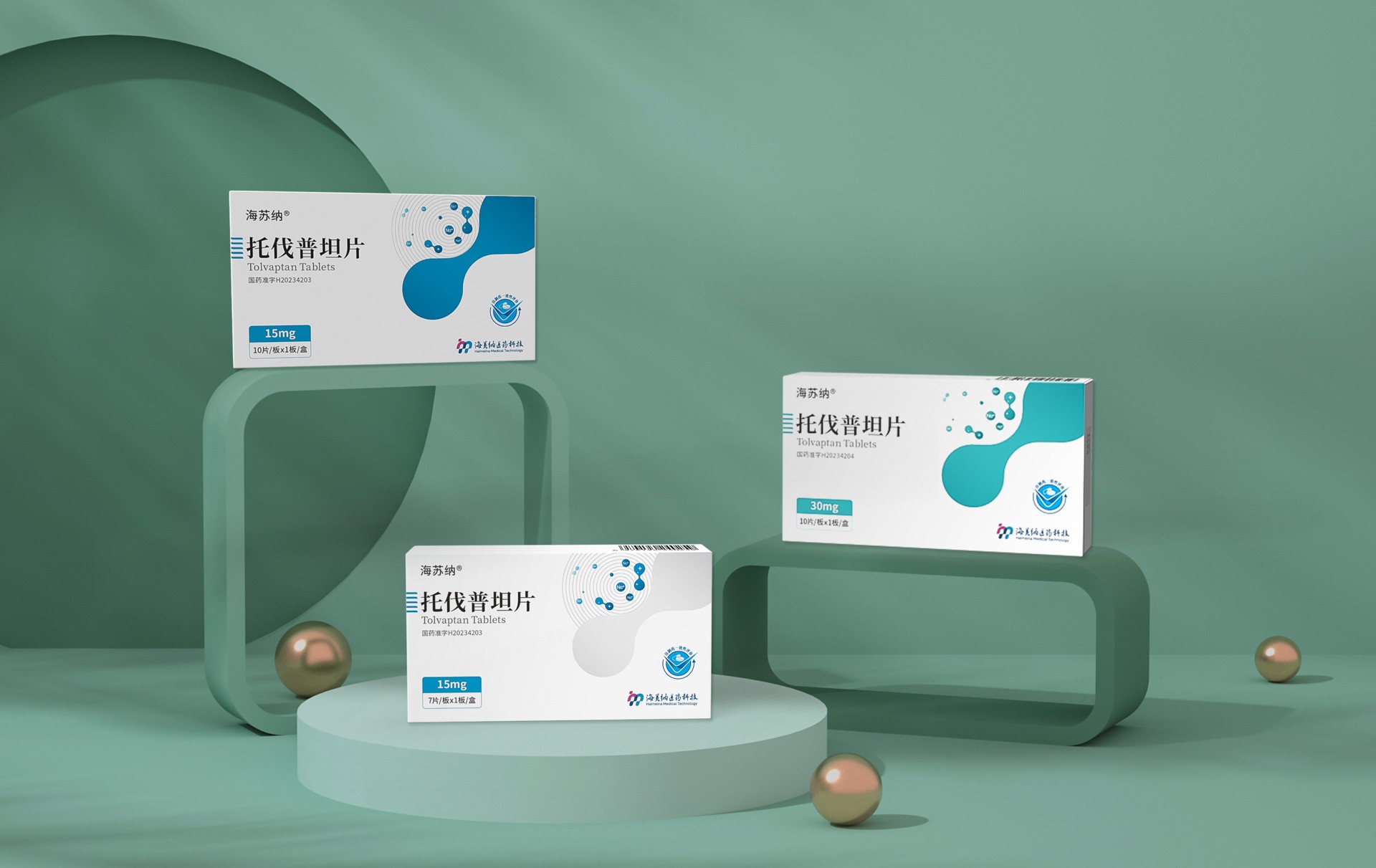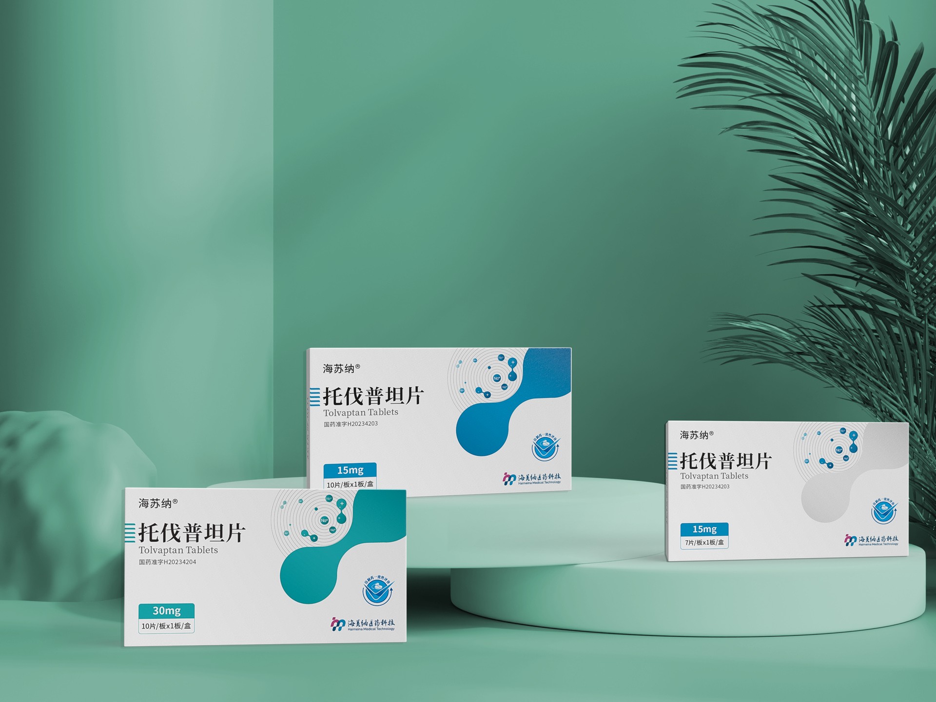 整個包裝盒以白色為主色調,展現出清新、純凈的視覺效果,符合醫療產品的專業形象。在盒子的設計上,巧妙地融入了綠色和藍色的設計元素,不僅為整體設計增添了活力,也與托伐普坦片的醫療屬性相呼應。 包裝盒的正面顯著位置印有“托伐普坦片”的中文和英文標識,字體清晰易讀,便于患者和醫護人員快速識別。同時,藥品的劑量“30mg”以及包裝規格“7片/板×1板/盒”等信息也得以明確標注,確?;颊吣軌驕蚀_了解和使用藥品。 包裝盒下方設計了一個淺綠色的圓形臺座,不僅為藥品提供了穩定的支撐,還增加了整體設計的層次感。背景墻采用淡綠色,并輔以垂直條紋裝飾,為整個包裝增添了現代感和時尚感。在包裝盒的背面或側面,應標注國藥準字、生產廠家、生產日期、有效期等詳細信息,確?;颊吣軌蛉媪私馑幤返南嚓P信息。 總的來說,托伐普坦片的藥品包裝設計既體現了醫療產品的專業性,又充分考慮了患者的使用體驗。通過簡約而不失設計感的外觀,以及清晰明了的文字信息,該藥品包裝能夠有效地幫助患者識別和使用藥品,提升了產品的整體品質和市場競爭力。