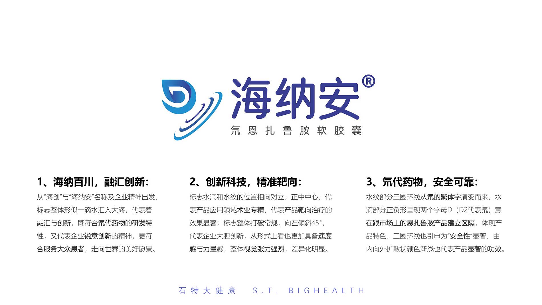 1、海納百川,融匯創新:從“海創”與“海納安”名稱及企業精神出發,標志整體形似一滴水匯入大海,代表著融匯與創新,既符合氘代藥物的研發特性,又代表企業銳意創新的精神,更符合服務大眾患者,走向世界的美好愿景。