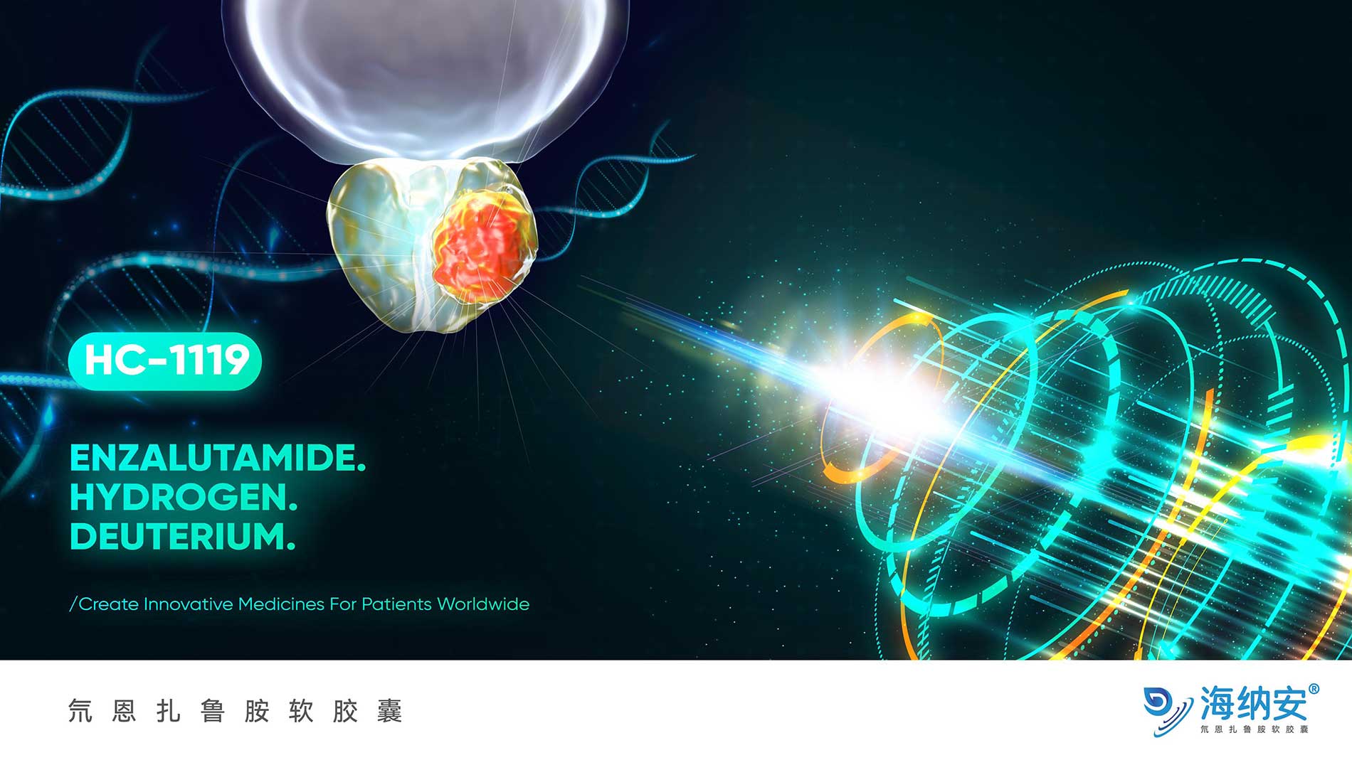 氘恩扎魯胺(HC-1119 軟膠囊)是公司自主研發的、治療轉移性去勢抵抗性前列腺癌(mCRPC)的 1 類新藥,是第二代雄激素受體(AR)拮抗劑恩扎盧胺的氘代藥物,獲得國家科技部2018 年 “重大新藥創制”科技專項支持。需求內容:產品圖形商標,產品主kv形象,延展物料:議程/邀請函模版、幻燈模版、席卡、接機牌,slogan和Key message建議方案;設計要求:1.符合行業調性,顯現創新藥屬性,匹配品牌定位,具有辨識度,2.須為原創設計,圖形商標能順利完成商標注冊,3.具有實用性及延展性(包括設計、印刷、展陳等多場景),4.滿足合規要求,符合社會公序良俗。
