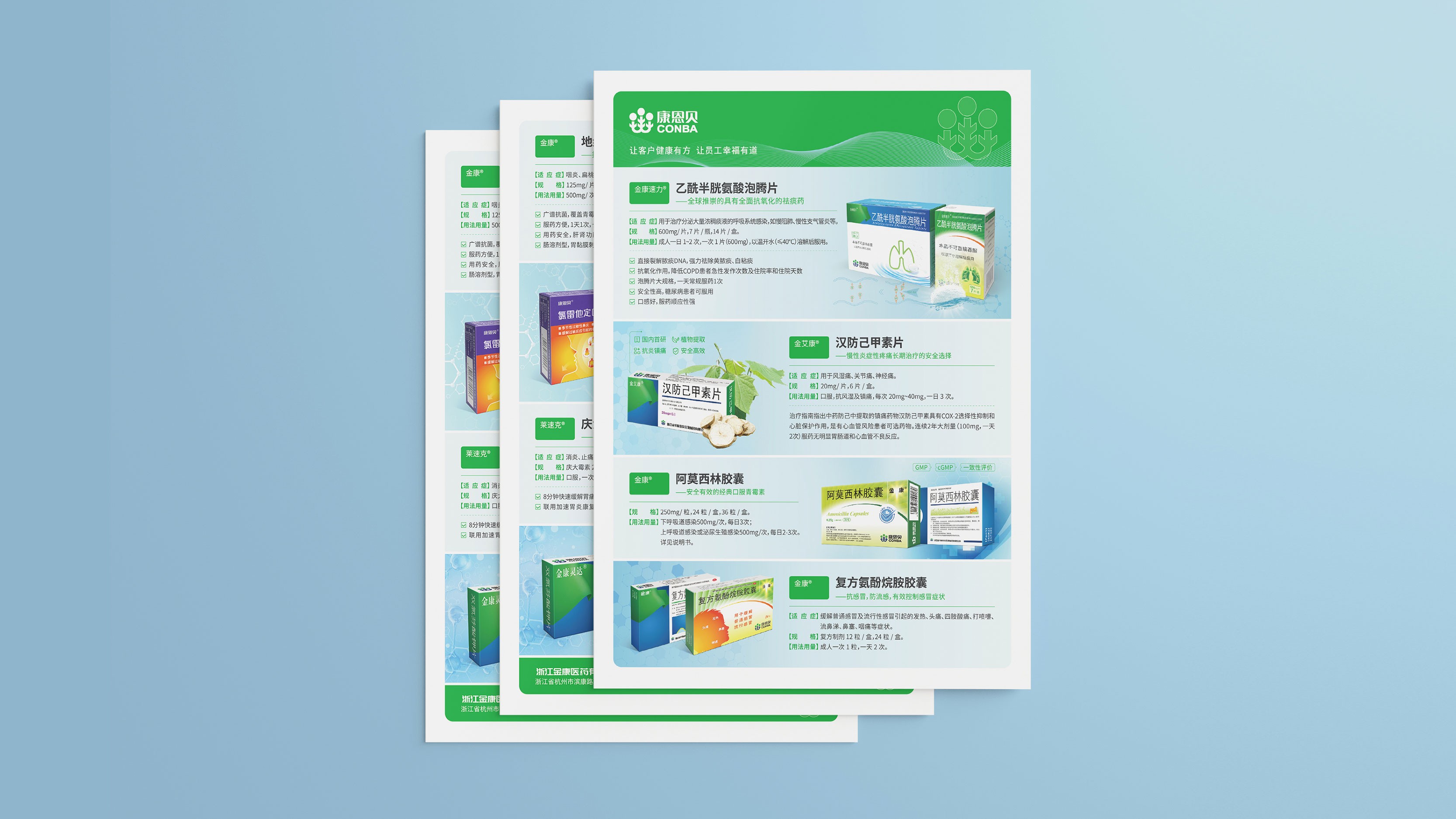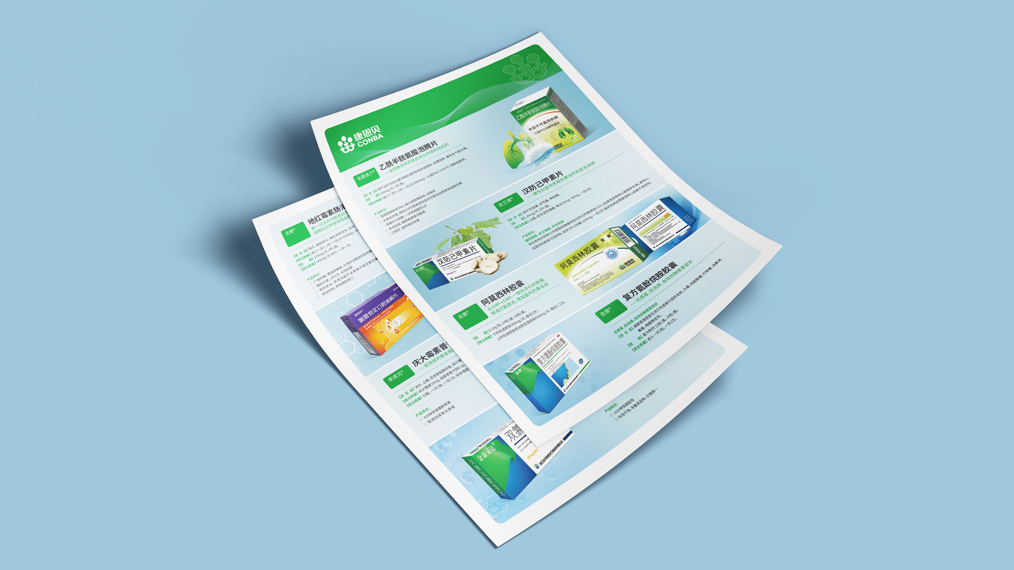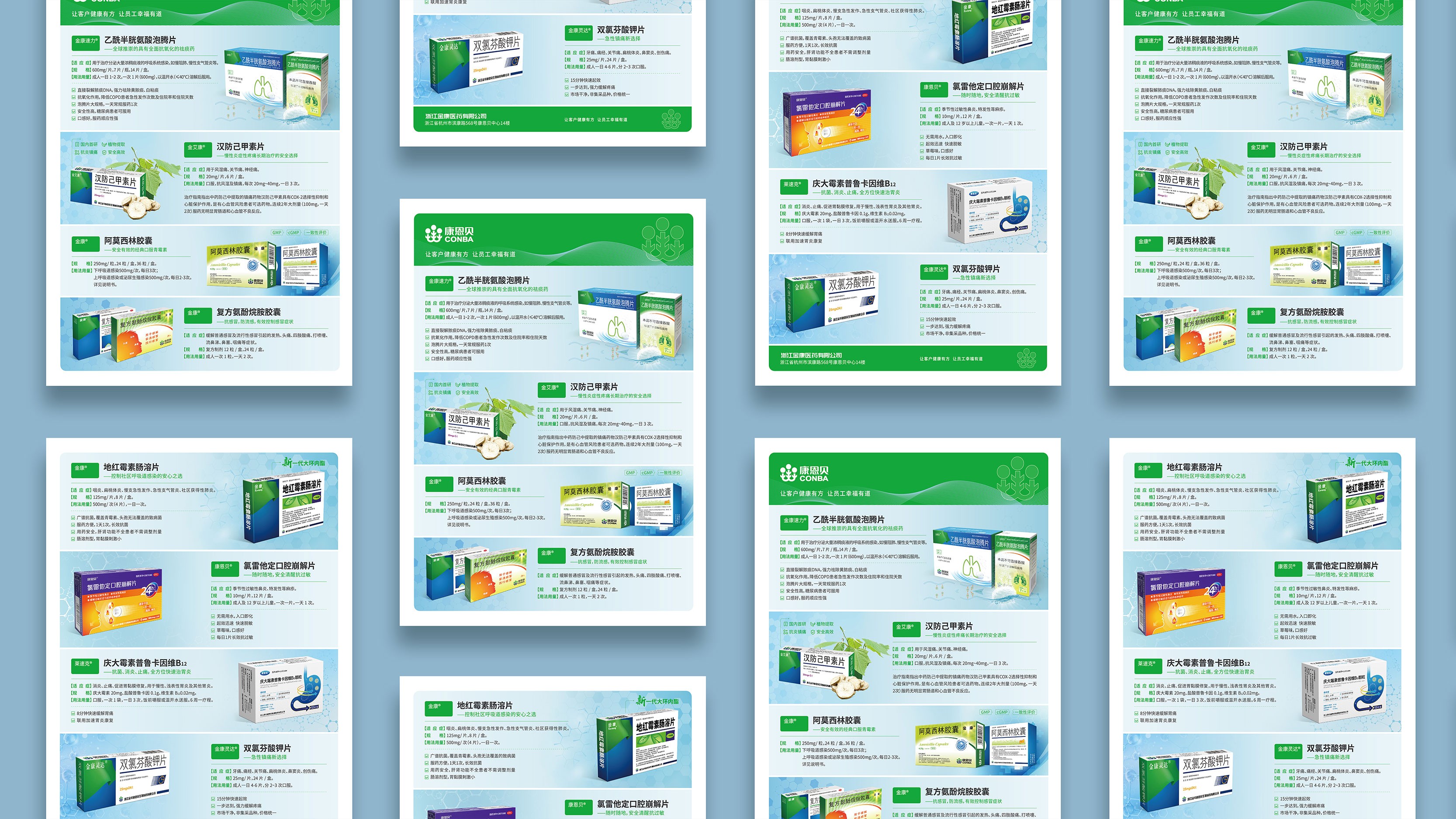 石特考慮到藥品的單頁具有針對性、獨立性的特點,因此在此次的設計中,石特根據藥品特點,藥物療效、進行構思:在產品的單頁設計上主要以綠色為主,藍色輔色為底色,綠色代表著健康,符合金康醫藥的行業定位,藍色與綠色的配合在視覺上給人一種清新的感覺,使人看了輕松愉悅;以圖文結合形式展示藥品,使閱讀更加便捷。