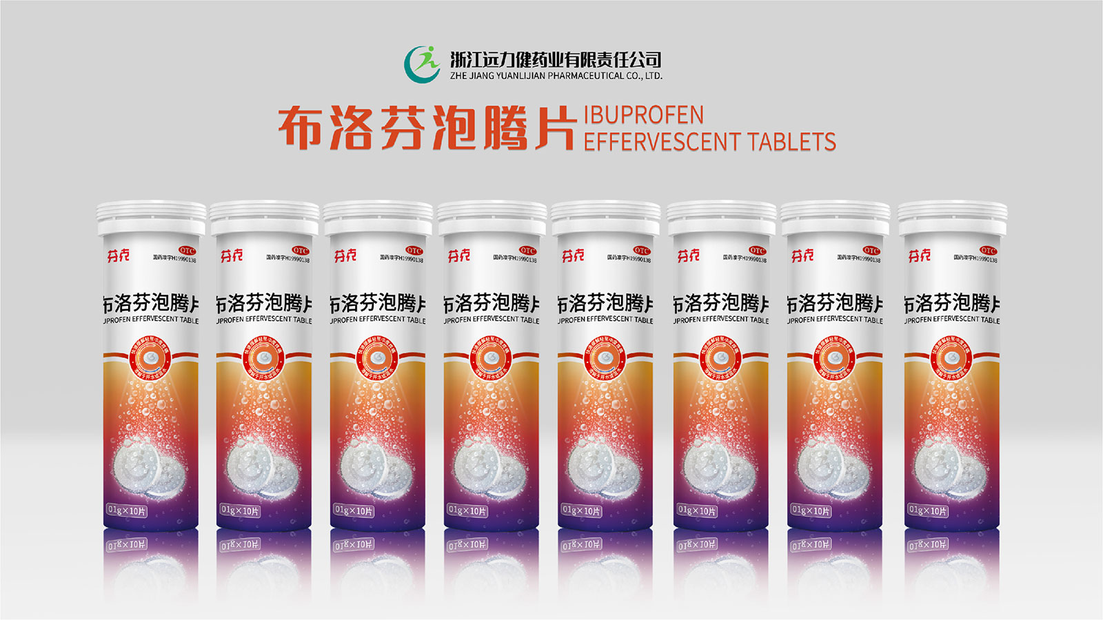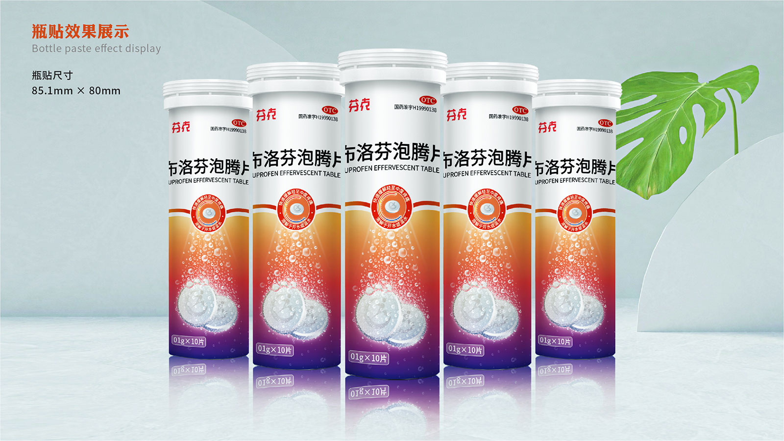 ③黃紅藍的漸變色塊部分與線條的融合如同水波,突出強調產品落入水中溶解的整體視覺感。④紅色、黃色代表疼痛,藍色代表著健康,黃紅漸變到藍色的過程如同服用本產品后身體疼痛得以緩解的過程。⑤畫面中部圓形圖標分割的部分,將時間、藥片、適應癥、服用方法融入其中,在時間色條上加入紅黃藍漸變色彩,代表產品能快速緩解身體疼痛。圖標位于大面積漸變色塊代表的水面位置,與下方產品形成視覺呼應。⑥畫面整體的視覺表現延續了前一款包裝(原包裝)的形式及色彩搭配,與前一款包裝形成系列。