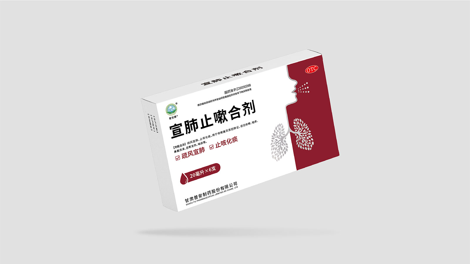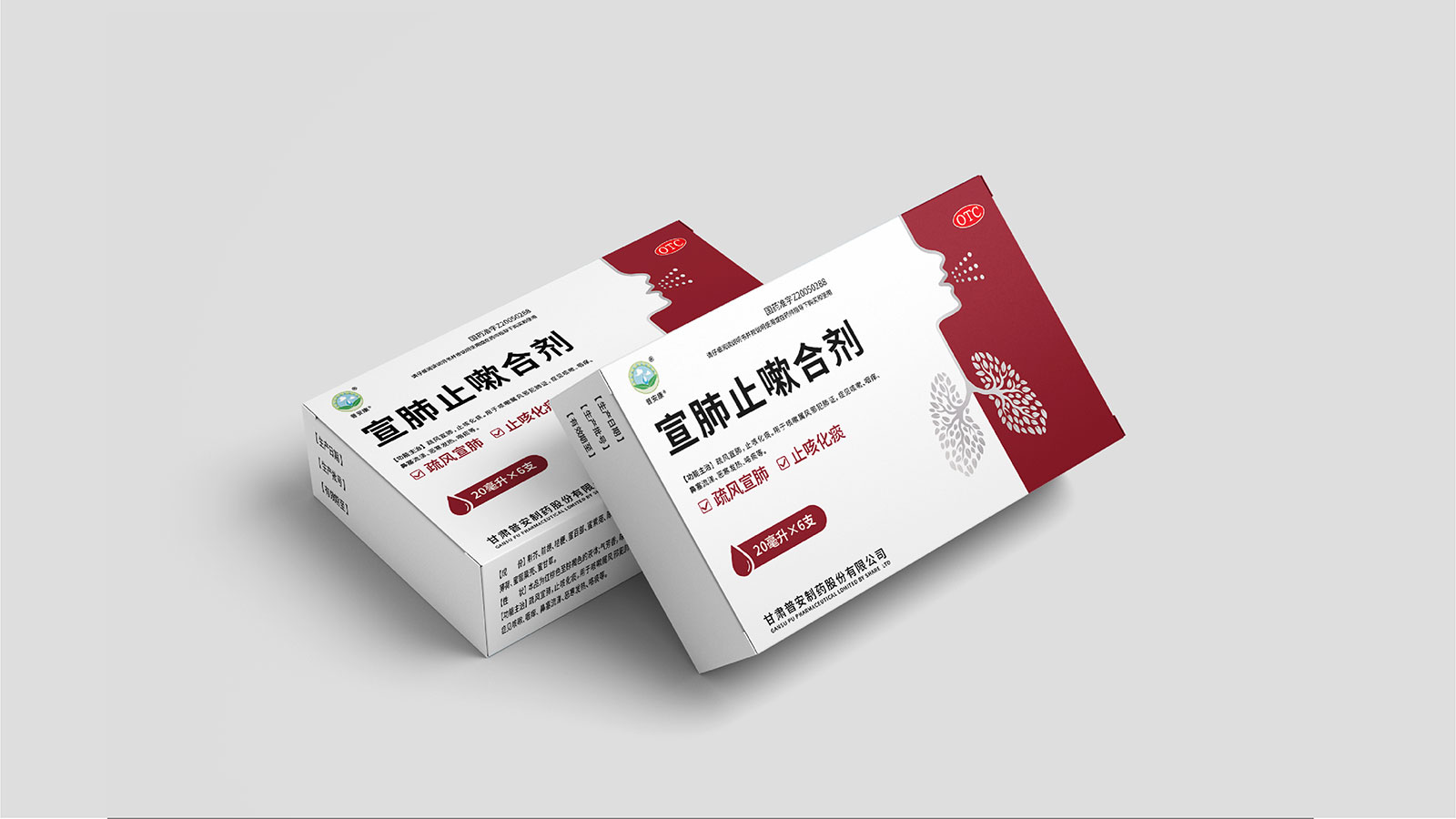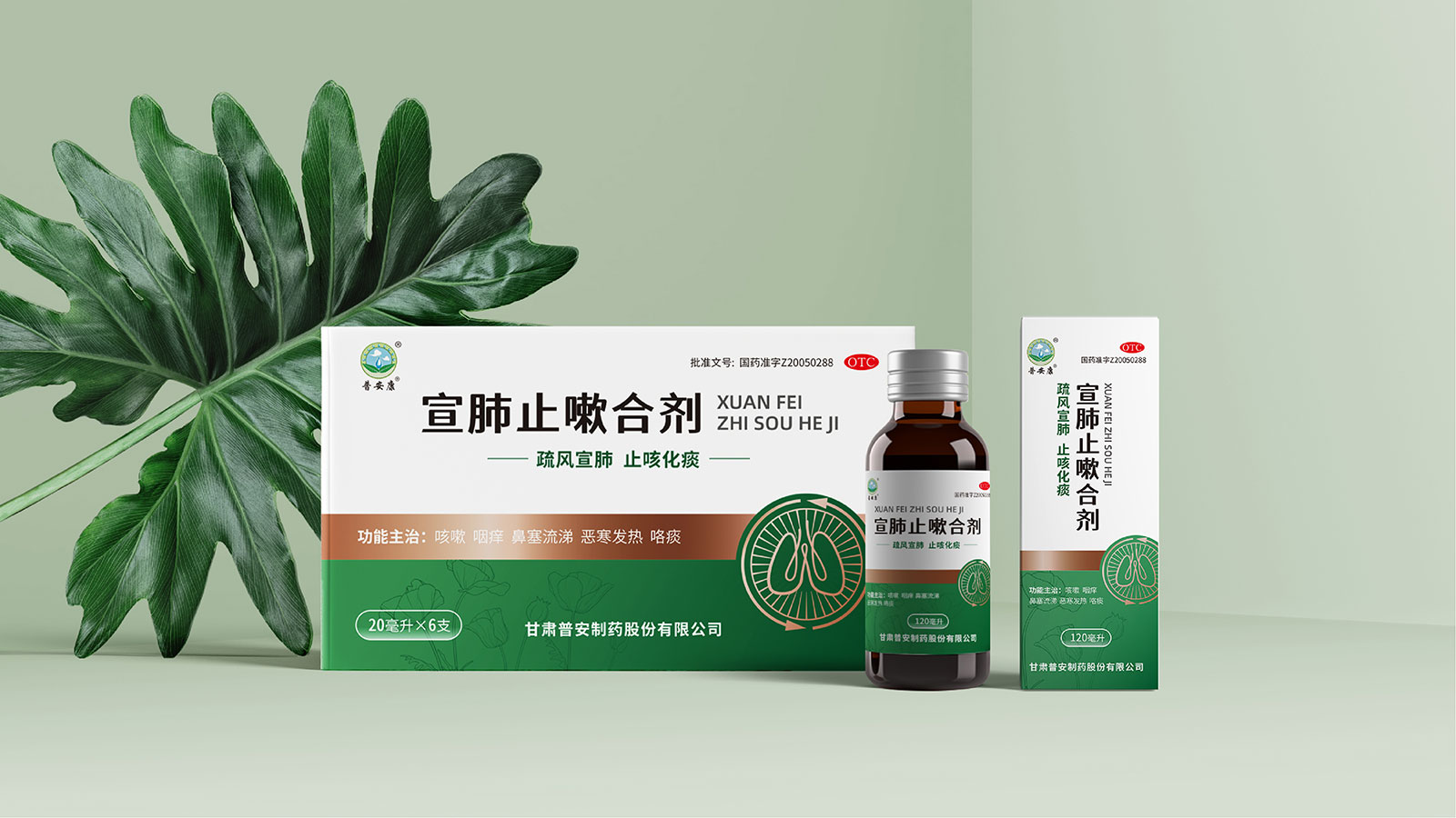 包裝整體風格以極簡為主,在凸出產品通用名的同時,將產品核心主治功能——疏風宣肺、止咳化痰以簡潔圖案展示于畫面,并作為畫面核心視覺元素。產品成分以中草藥為主,又聯想到產品功能主治特征,顧將兩者結合,用代表中草藥的樹葉和肺的整體形態進行融合、替換,凸顯產品中成藥屬性,將肺、呼吸道、人物側臉剪影和代表呼吸感的小點相結合,呼應產品主治功能特征??紤]到產品性狀為液體形態,因此將代表液體的水滴形態融合畫面和產品規格相結合,并做強調處理,凸顯產品性狀的同時以便于消費者準確查看及區分產品不同規格。