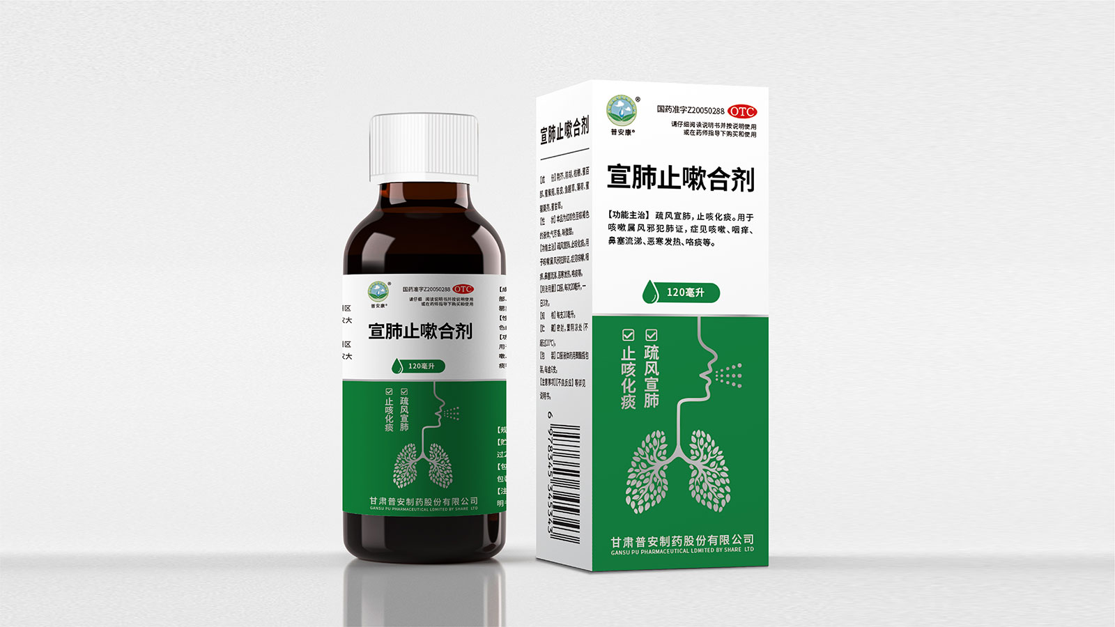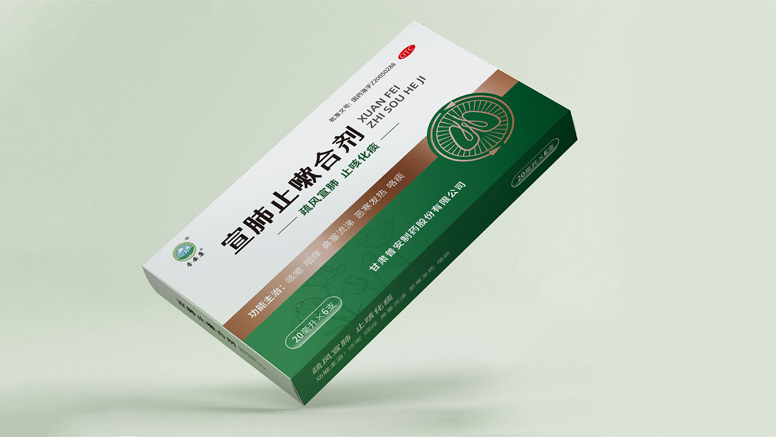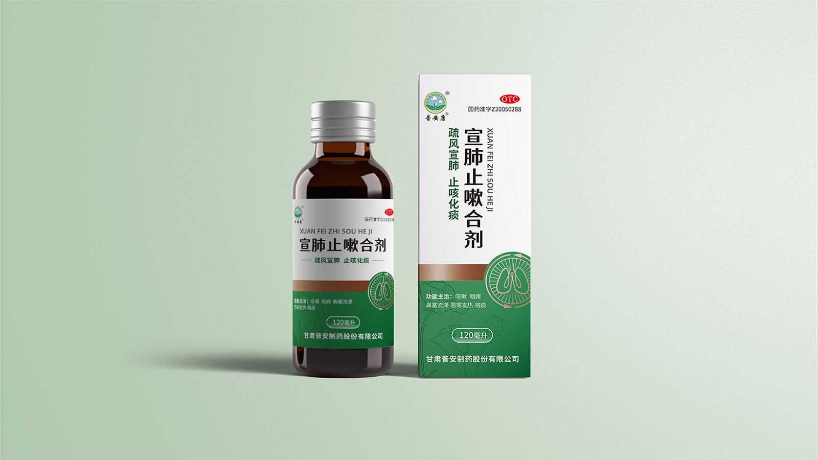 包裝整體風格以極簡為主,在凸出產品通用名的同時,將產品核心主治功能——疏風宣肺、止咳化痰以簡潔圖案展示于畫面,并作為畫面核心視覺元素。產品成分以中草藥為主,又聯想到產品功能主治特征,顧將兩者結合,用代表中草藥的樹葉和肺的整體形態進行融合、替換,凸顯產品中成藥屬性,將肺、呼吸道、人物側臉剪影和代表呼吸感的小點相結合,呼應產品主治功能特征??紤]到產品性狀為液體形態,因此將代表液體的水滴形態融合畫面和產品規格相結合,并做強調處理,凸顯產品性狀的同時以便于消費者準確查看及區分產品不同規格。