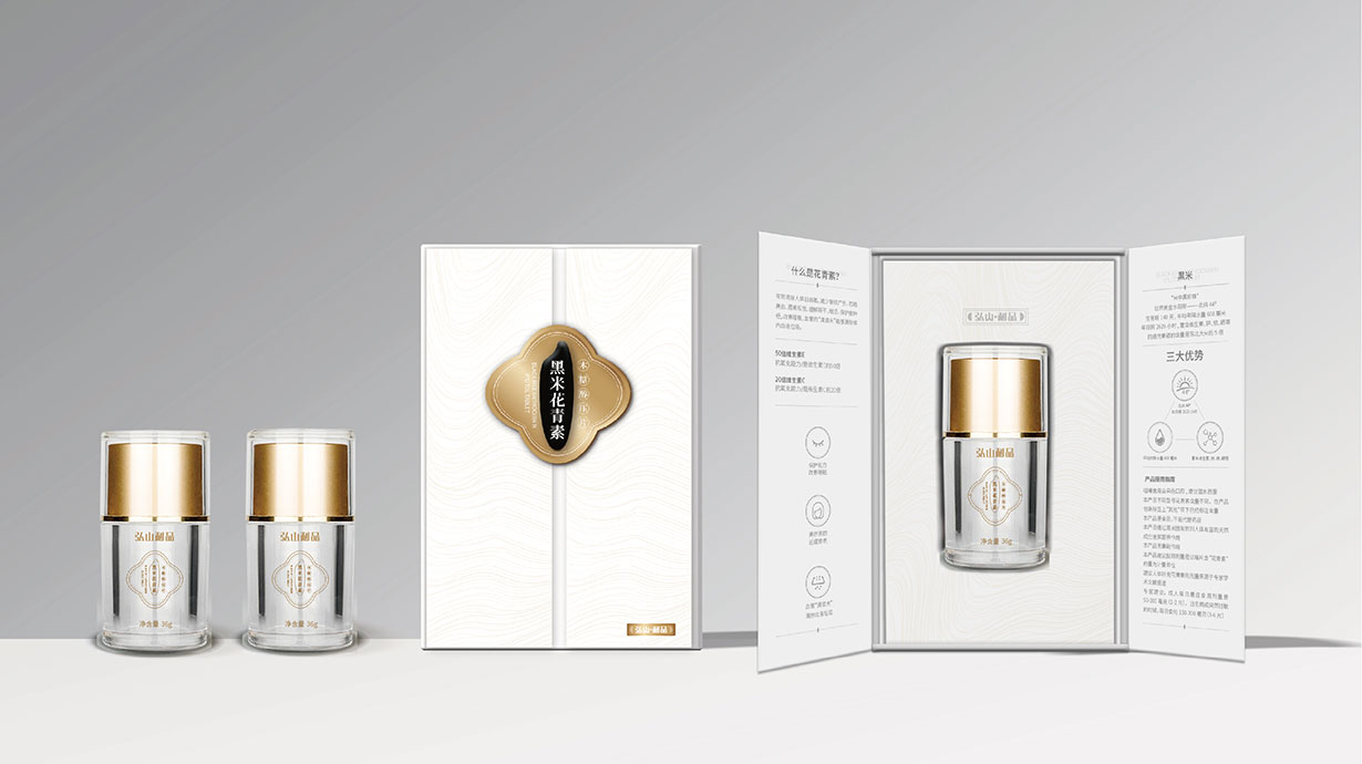 首先內盒采用透明食用級亞克力瓶身,對品牌獨有標牌和弘山利品品牌標簽進行設計,黑米+花的形狀,結合黑米的黑,體現“米中黑珍珠”的營養價值;再用金色,其一含義是黑米稻穗的顏色,體現天然無添加的自然感受;其二含義是黑米花青素是色素之精品,體現其高貴地位。通過包裝升級統一形象后,深化了弘山禮品在用戶心中的外在形象,品類包裝問題得以解決。