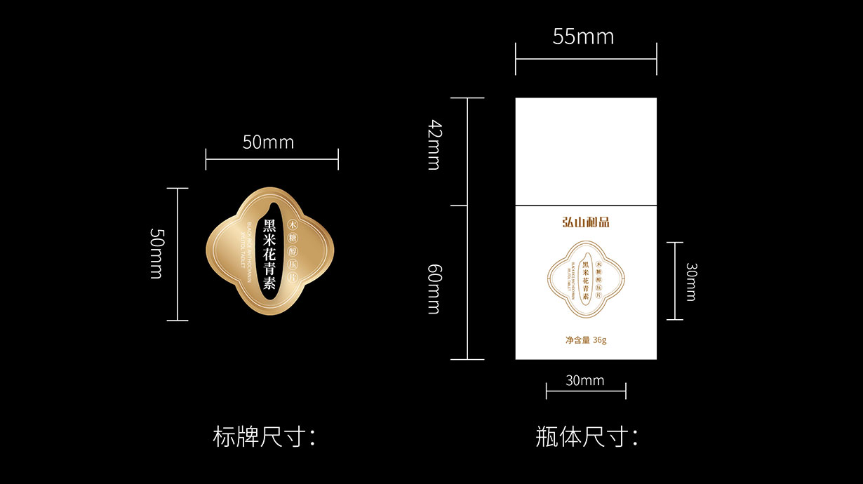 花青素,自然界一類廣泛存在于植物中的水溶性天然色素,也是植物花瓣中的主要呈色物質,水果、蔬菜、花卉等五彩繽紛的顏色大部分與之有關,它廣泛存在于黑米、藍莓、越橘、紫甘藍等植物中,是一種具有一定營養和藥理作用的純天然食用色素,可以抵抗因人體自由基引起的多種相關疾病。原黑米花青素的包裝沒有過多的創意,瓶身形狀沒有特色,只有一個單一的LOGO,不利于品牌傳播。