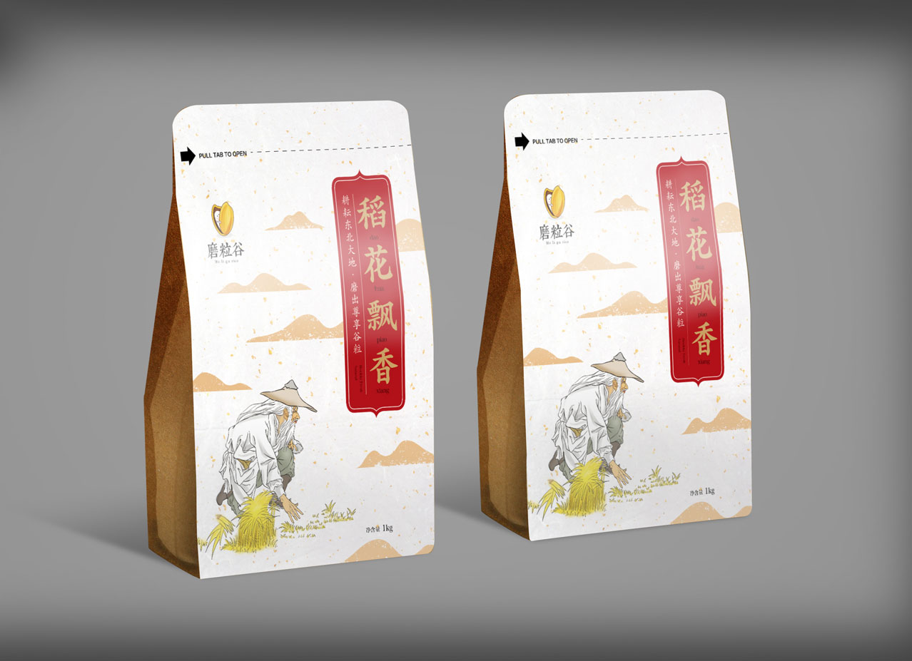 做最好產地的米,分享自然的味道,是磨粒谷米業的品牌理念。我們將這一理念融合進包裝里,整個系列的產品包裝畫面都運用自然的元素去拼接,把屬于大米的那份天然的濃香傳達給客戶。部分產品包裝上運用了地域元素拼貼+撞色,將東北虎、查干湖和松磨這些具有代表性的元素進行拼貼,再加上深沉的紅色做烘托給人強烈的年代感和悠久感。