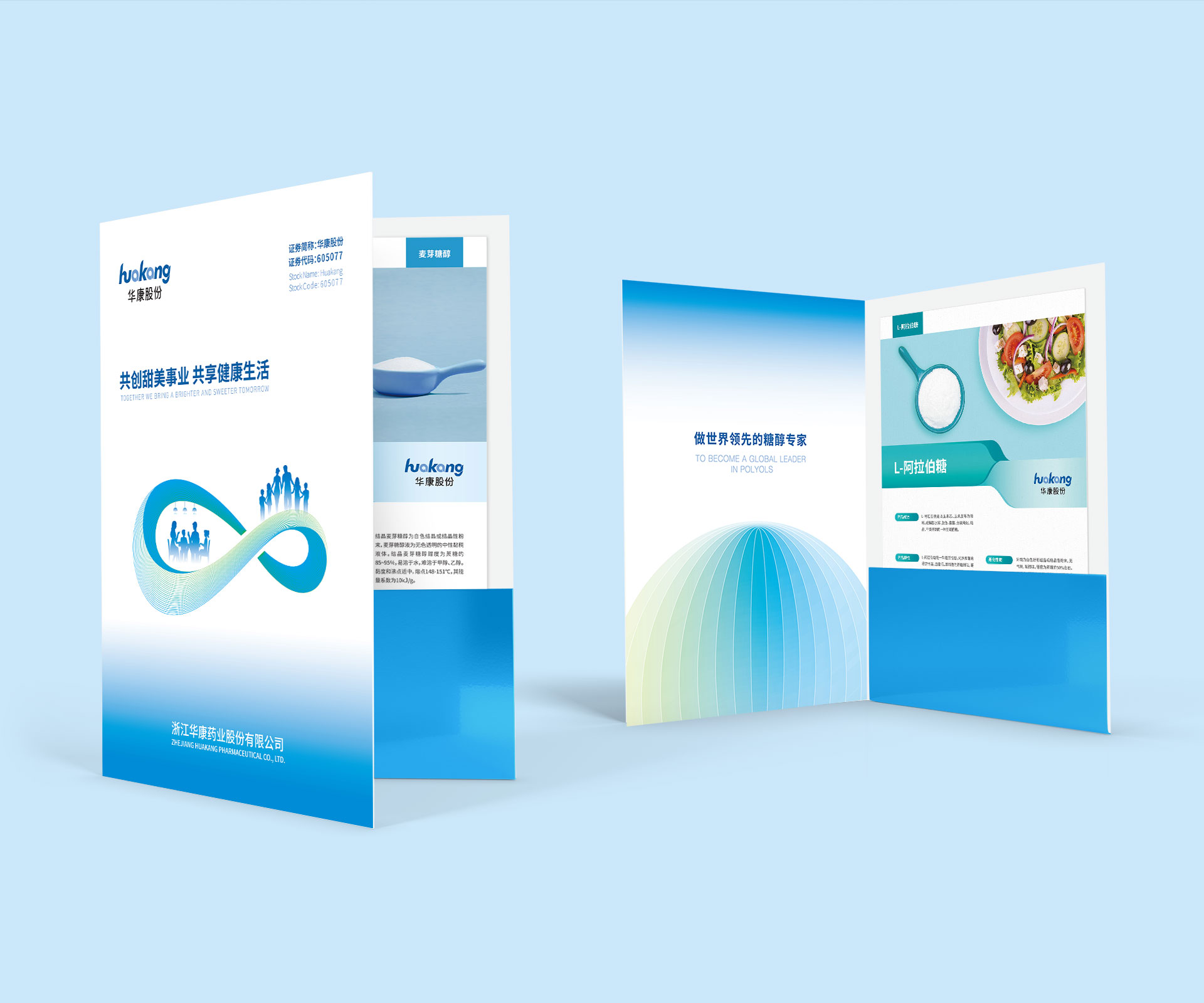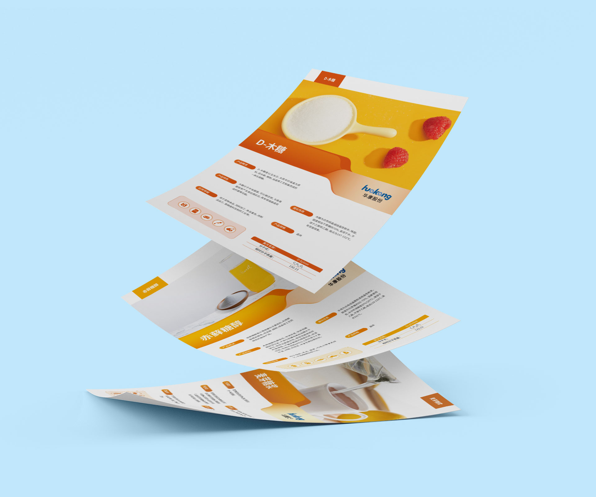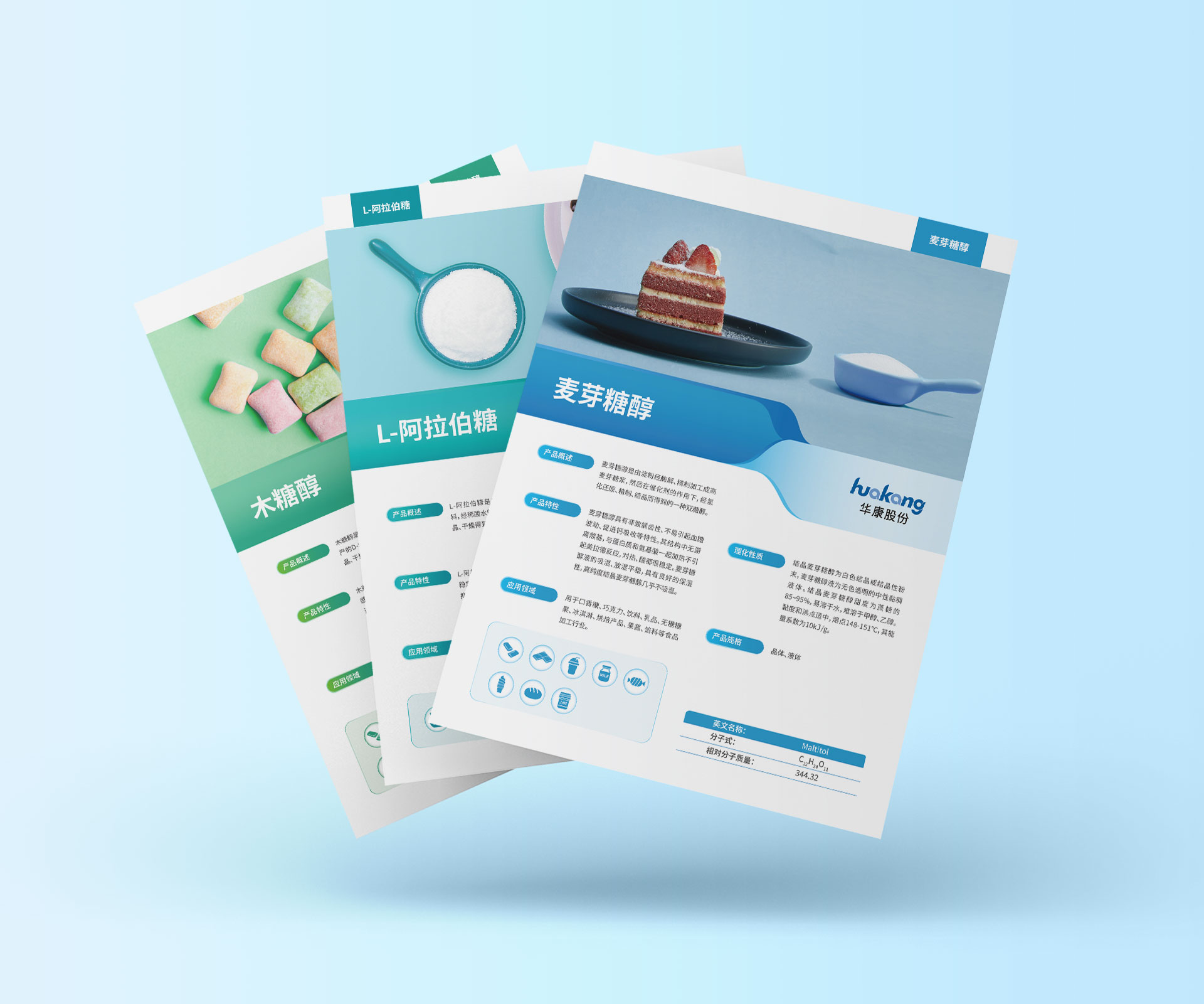 將封套與單頁設計風格,延伸至企業其他宣傳物料(如畫冊、展會展板 ),構建 “統一視覺語言 + 分層價值傳遞” 的品牌傳播體系。當客戶接觸華康藥業的宣傳物料時,通過一致的色彩、符號、文案風格,持續強化 “健康糖醇專家” 的品牌認知,助力企業在大健康配料市場建立差異化競爭優勢。