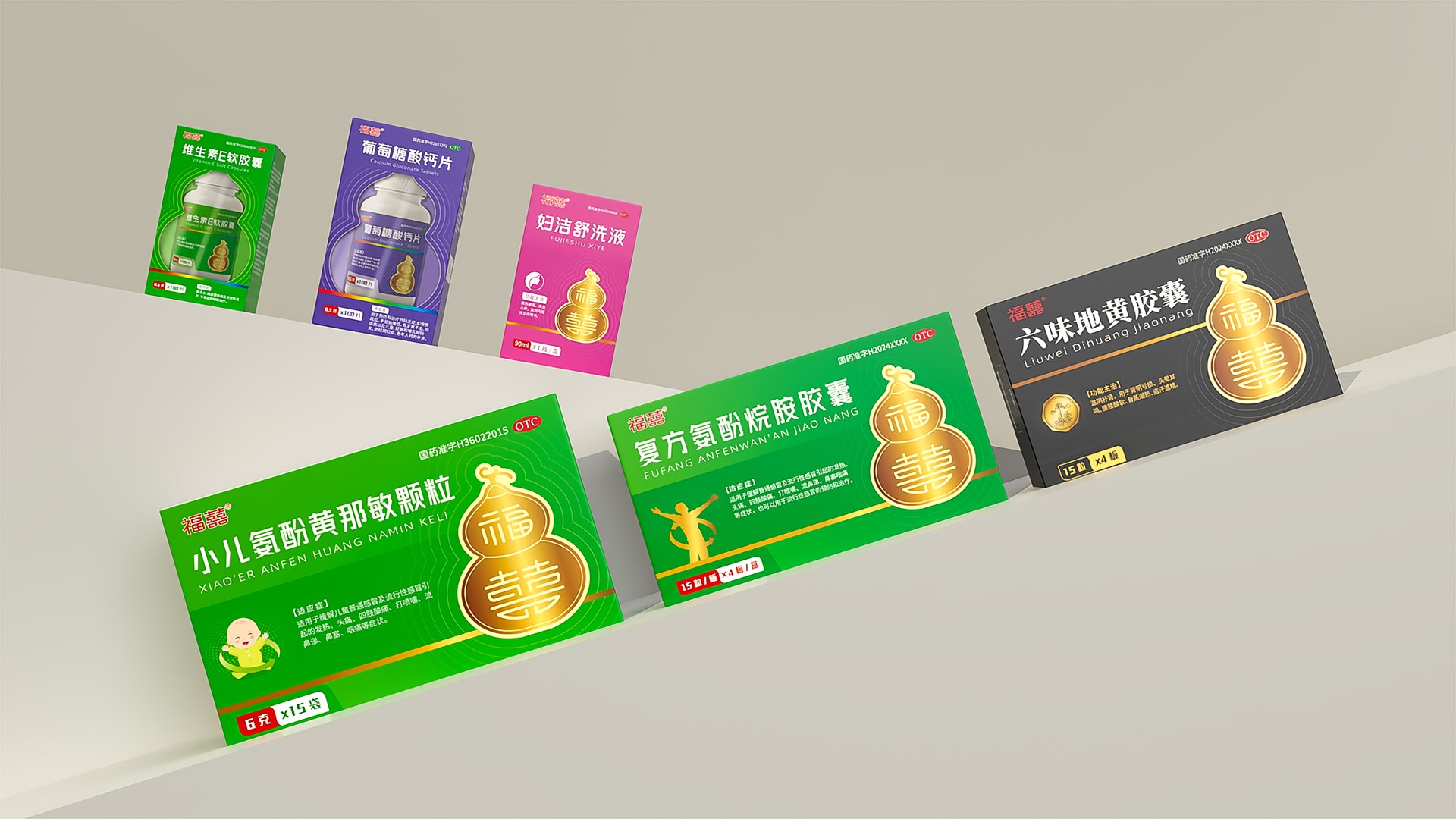 本項目是石特大健康為江蘇福囍醫藥科技有限公司提供的品牌視覺體系落地應用案例。在前期為其完成從“福囍”LOGO到“葫蘆”超級符號,再到整套品牌VI系統的構建后,我們進一步將這一全新的品牌基因,深度應用于其旗下六味地黃膠囊、維生素E軟膠囊、葡萄糖酸鈣片、小兒氨酚黃那敏顆粒、婦潔舒洗液等涵蓋不同品類、不同劑型的核心產品包裝上。我們的目標是將統一的品牌戰略轉化為觸手可及的市場競爭力,確保每一款產品在貨架上都能清晰傳遞“福囍”品牌的溫暖、吉祥與專業感,實現品牌形象與產品銷量的同步提升。