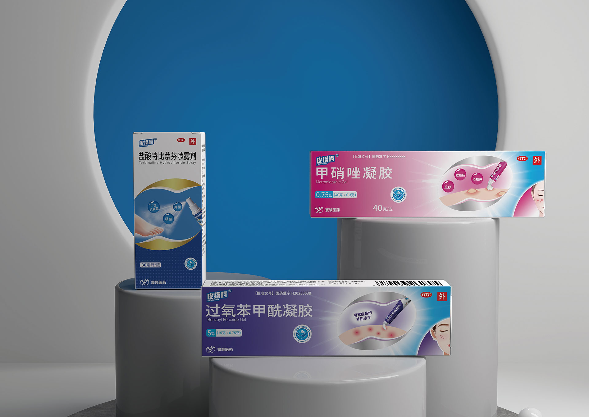 功能差異化與統一性的矛盾:甲硝唑凝膠(祛痘/抗炎)、鹽酸特比萘芬噴霧劑(抗真菌)、過氧苯甲酰凝膠(祛痘/殺菌)分屬不同治療領域,包裝需在統一家族感下,清晰傳遞各自的功能差異。